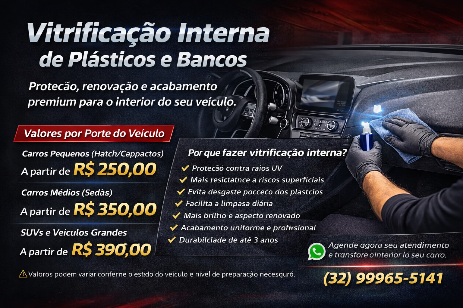 A vitrificação interna é um processo avançado que cria uma camada protetora sobre plásticos e bancos, protegendo contra desgaste, raios UV e sujeiras do dia a dia.Ideal para quem deseja manter o carro com aparência de novo por muito mais tempo, com acabamento uniforme e profissional.