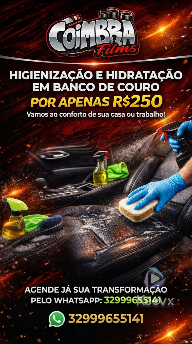 A Coimbra Films também cuida do acabamento interno do seu carro com serviço de higienização e hidratação em bancos de couro, devolvendo aparência renovada, toque macio e mais conservação para o material.